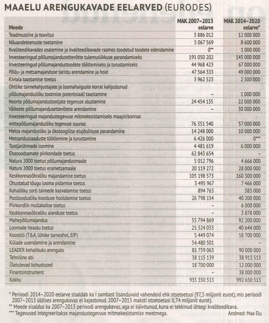 See on tõesti muutunud, sest prioriteedid ja rõhuasetused teisenevad. Näiteks maaelumitmekesistamise osas on eelarve pigem vähenenud, kuna mõningaid tegevusi turismi valdkonnas me uuel finantsperioodil ei toeta. Töötleva tööstuse investeeringumeede on kasvanud, sest tööstuse arengust sõltub kogu põllumajandussektori edukus. Põllumajandusettevõtete investeeringutoetuse summat vaadates tundub, nagu oleks meede väiksemaks jäänud, kuid tegelikult mitte – põllumajandusinvesteeringud saavad toetusi ka teiste meetmete kaudu. Oma toetus on väikestele põllumajandustootjatele ning plaanime anda laene ja garantiisid, mis on samuti investeeringute toetamine.