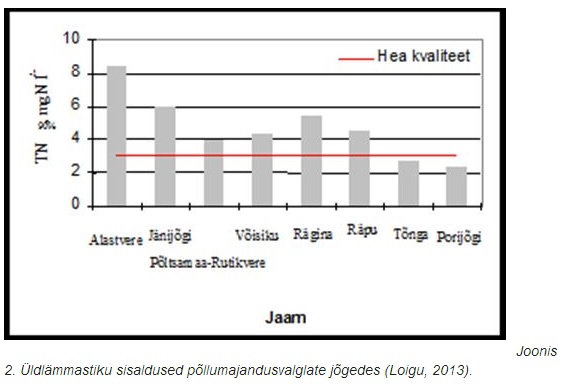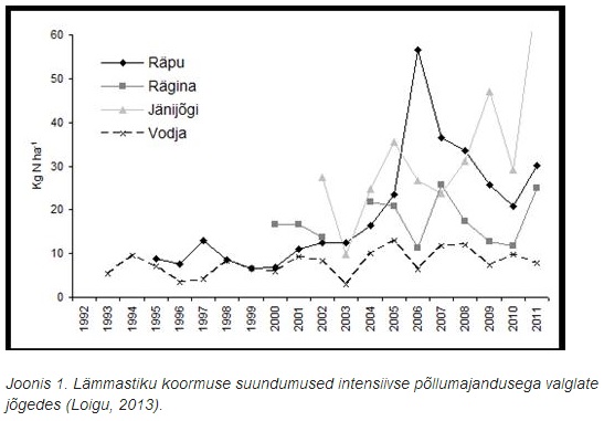 Tallinna Tehnikaülikooli professor Loigu uuringud näitavad N ja P sisalduse suurenemist nii pinna kui põhjavees viimase paarikümne aasta jooksul. Meie intensiivsema tootmisega Pandivere põllumajandusaladelt vettkoguvates Rägina peakraavis, Räpu, Vodja ja Jänijões avalduvad N sisalduse tõusu tendentsid (Joonis 1), samasugused suundumused esinevad ka P osas.