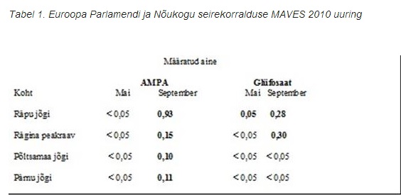 Enimkasutatavat umbrohutõrjevahendit glüfosaati ja tema preparaatide laguprodukti AMPA, mis on osutunud praeguste uuringute alusel glüfosaatidest toksilisemaks, esineb meie paljude jõgede vees ja merre suubumise aladel ning paiguti üle nn kehtestatud piirnormide (tabel 1). Glüfosaat on mürgine vee pisielustikule – planktonile ja akumuleerub kalades. 2011. aastal uuris Keskkonnauuringute keskus merest püütud ahvenais 11 juba keelustatud tõrjevahendi jääkide sisaldust ning kõik need esinesid kalades. Teadusuuringud on näidanud, et niisuguste kalade immuunsüsteem nõrgeneb, nad langevad kergesti parasiitide ja haiguste ohvriks.