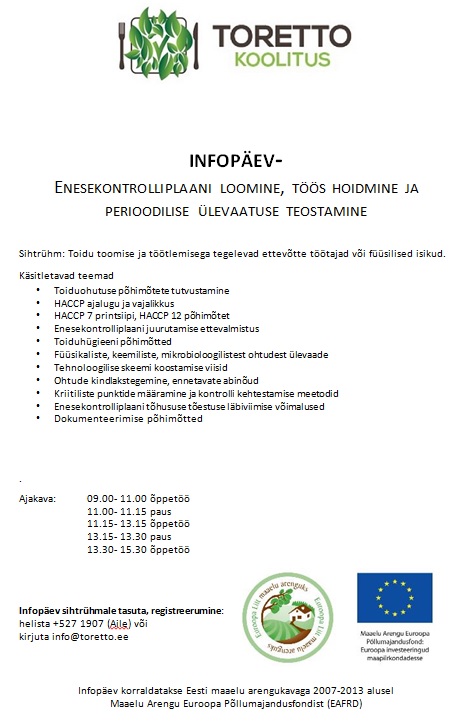 Toretto OÜ korraldab infopäeva „Enesekontrolliplaani loomine, töös hoidmine ja perioodilise ülevaatuse teostamine“ alljärgnevalt: